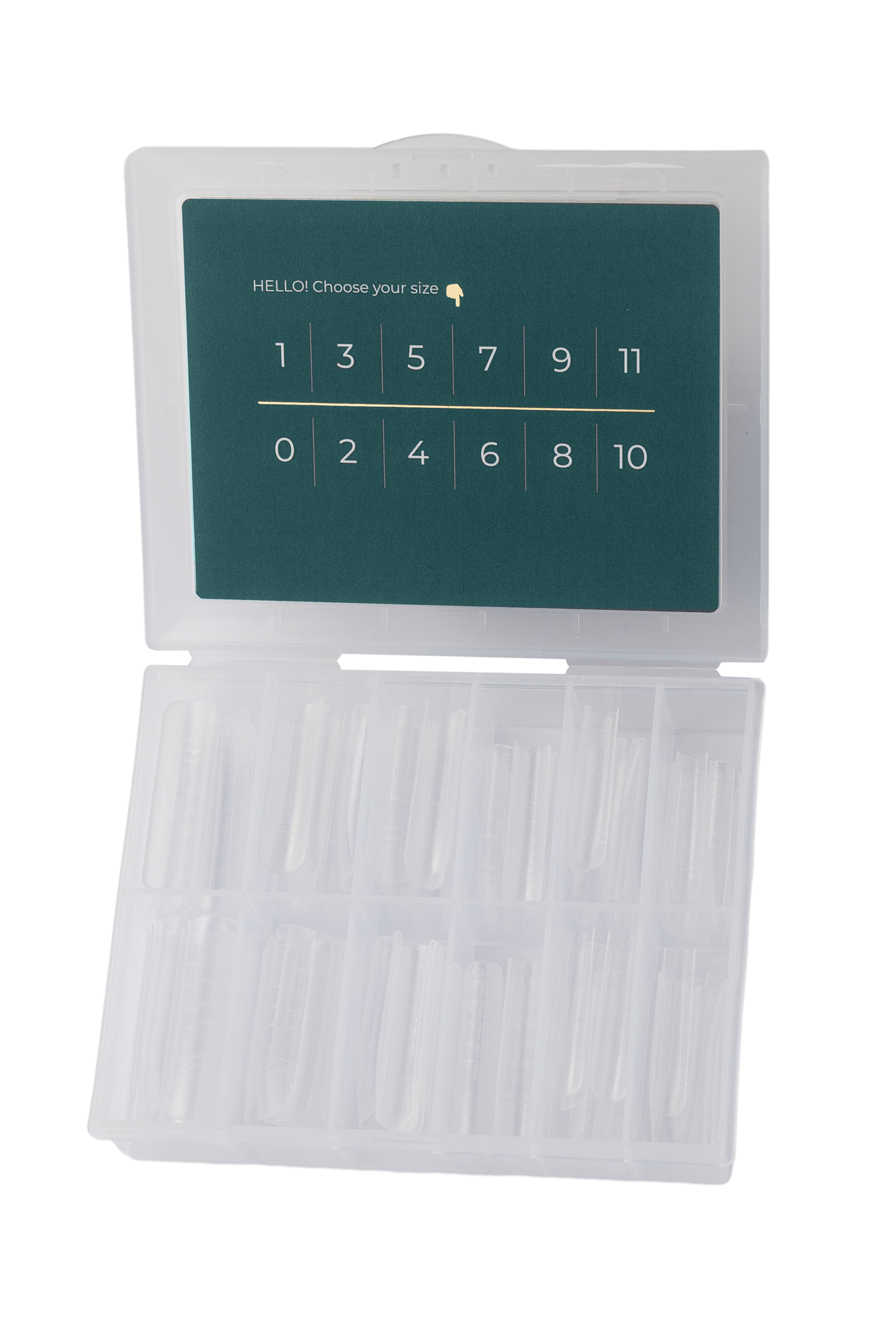 Komplektā ir 120 gabali: 12 izmēri pa 10 gabaliem katrā, lai jūs varētu viegli izvēlēties nepieciešamo formu jebkura veida un izliekuma nagu plāksnei.
